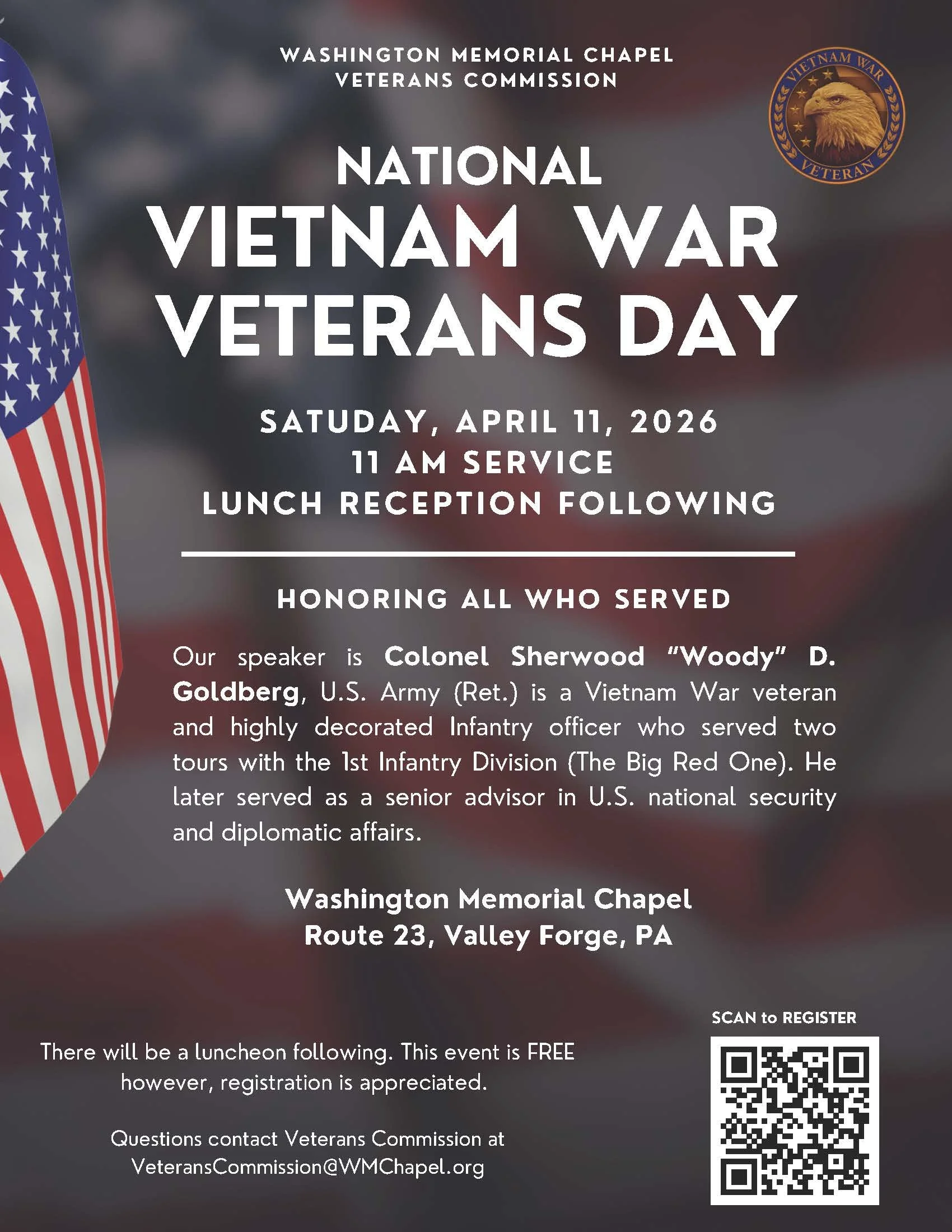 Our guest speaker will be Colonel Sherwood “Woody” D. Goldberg, U.S. Army (Ret.), a Vietnam War veteran and highly decorated Infantry officer who served two tours with the 1st Infantry Division (The Big Red One). Following his military service, Colonel Goldberg served as a senior advisor in United States national security and diplomatic affairs.