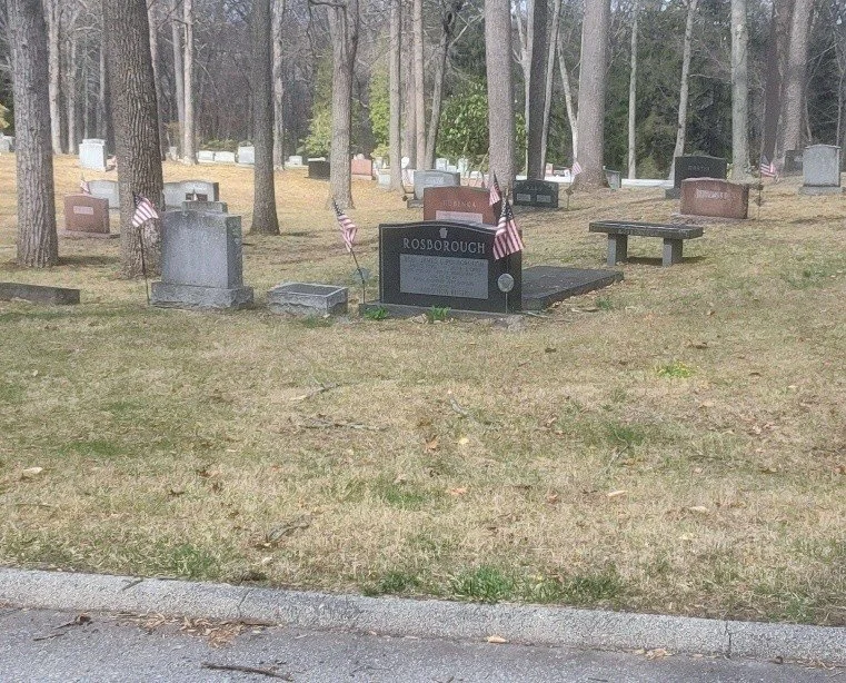 Location: Heading west (toward Defenders Gate) from the Cabin Shop parking lot drive along the upper churchyard road, the Rosborough gravesite is about 50 feet in and obvious.