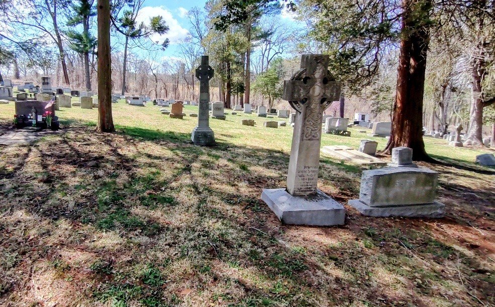 Location: Proceeding west along the upper churchyard drive to where the upper drive turns down to meet the middle drive, on the right (or left as you turn down) is the large Celtic cross marking Burk’s grave.