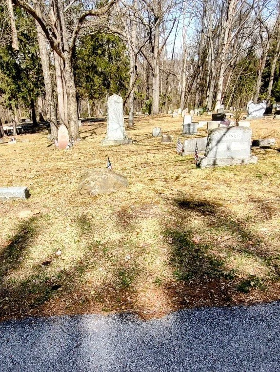 Location: Heading back east (toward the Chapel) on the middle churchyard drive, about 50 yards east of the Burk cross is a plain rock boulder sometimes marked with an American flag next to Schuylkill (downhill) side of the drive is the Sears gravesite. The name “SEARS” is on the downhill side.
