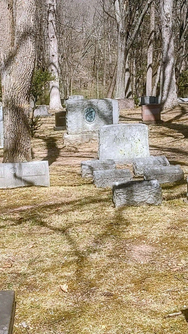 Location: Middle churchyard drive, on the same side and about 50 feet east of the Sears rock and about 70 feet downhill from Oswald/Voorhees graves is the Buck Taylor grave, marked with a bronze portrait of him.