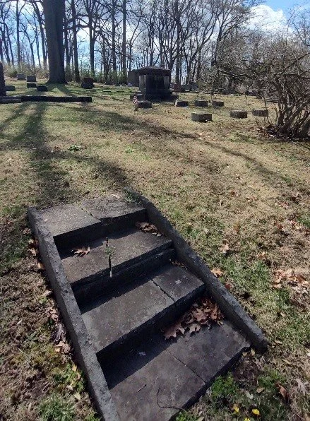 Location: Proceeding west along the upper churchyard road you come to a set of stone steps. About 60 feet above them and to the right is the large rectangular Knox marker.