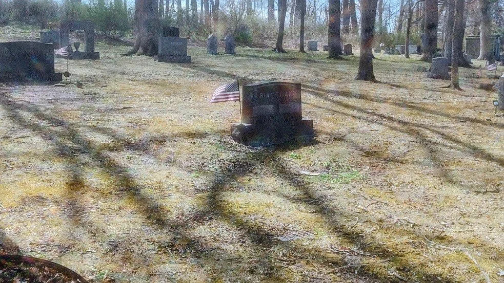 Location: Looking up from the Rosborough gravesite across the upper churchyard road toward Route 23, next to the tree line, are two ogive shaped grave markers together. One of them is Alex Scott’s.
